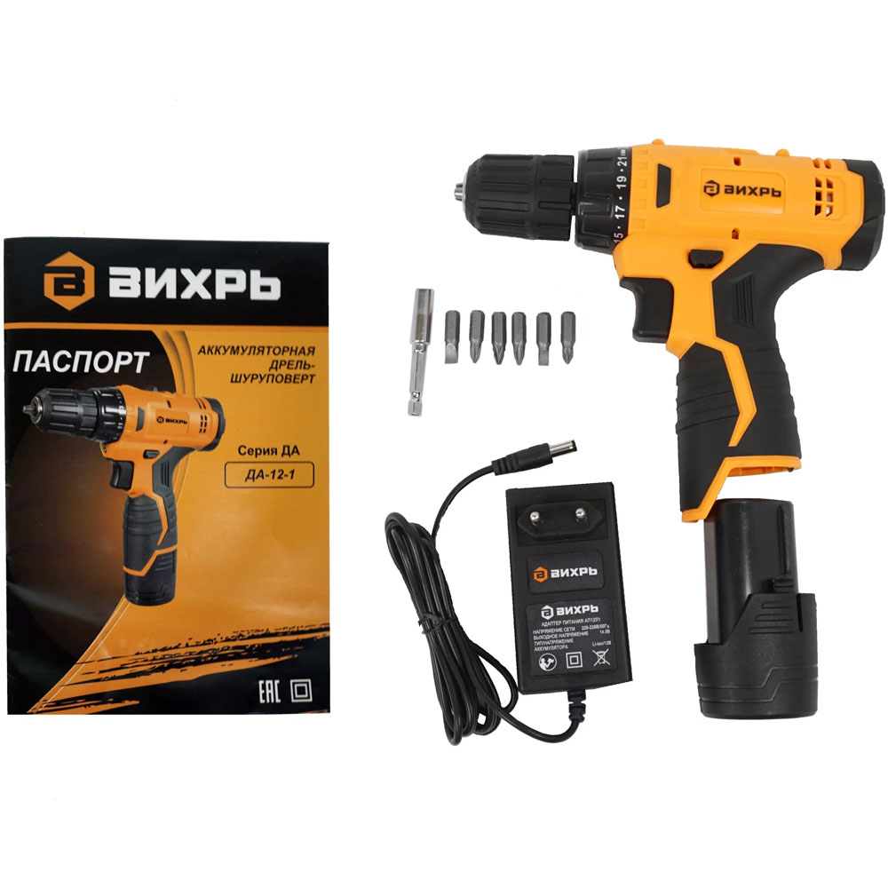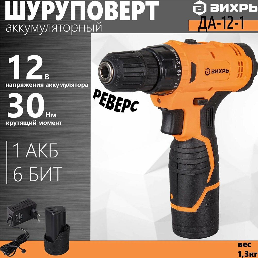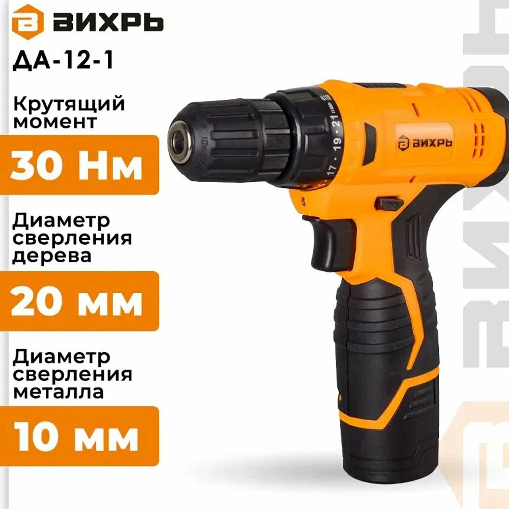 Модель вихрь ДА-12-1 получила систему регулирования частоты вращения в диапазоне от 0 до 600 об/мин, что позволяет настраивать инструмент для определенной толщины материала. Патрон, используемый в этой модели дрели-шуруповерта, быстрозажимной, поэтому замена биты или сверла не занимает много времени. Прорезиненная ручка позволяет удобно удерживать инструмент. Для большего удобства в инструменте реализован тормоз двигателя, мгновенно останавливающий вращение при отпускании кнопки «Пуск».