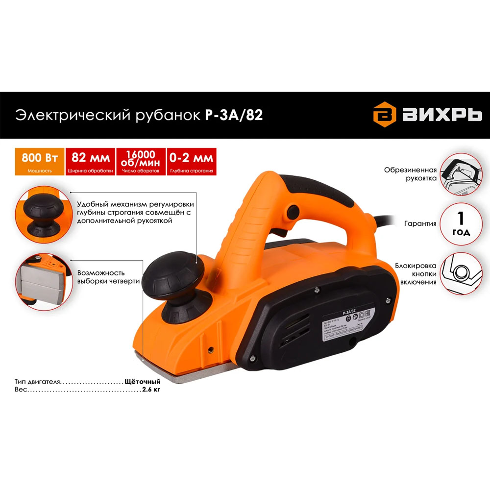 Электрический рубанок Вихрь Р-3А/82 имеет компактные габариты и малый вес 2,6 кг. На его корпусе предусмотрен патрубок для подключения пылесоса. Это позволяет минимизировать количество пыли в воздухе и сохранить рабочее место чистым. Кнопка блокировки препятствует непреднамеренному включению инструмента и гарантирует безопасность использования. В комплектацию входит мешок для опилок. Длина кабеля 2 м обеспечивает удобство движения во время использования рубанка.