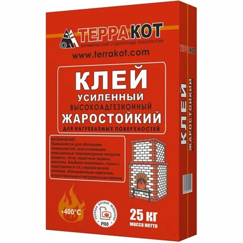 Жаростойкий усиленный клей «Терракот» применяется для облицовки печей, каминов, печей-барбекю, мангальных зон, банных экранов и прочих нагреваемых поверхностей керамической плиткой, природным камнем и облицовочным керамическим кирпичом, а также для монтажа полов с подогревом. Жаростойкий клей обладает высокой силой сцепления с поверхностью и пластичностью. При соблюдении рекомендуемой толщины слоя не стекает с поверхностей. Стойкий к воздействию влаги и повышенных температур (до +400°С).
