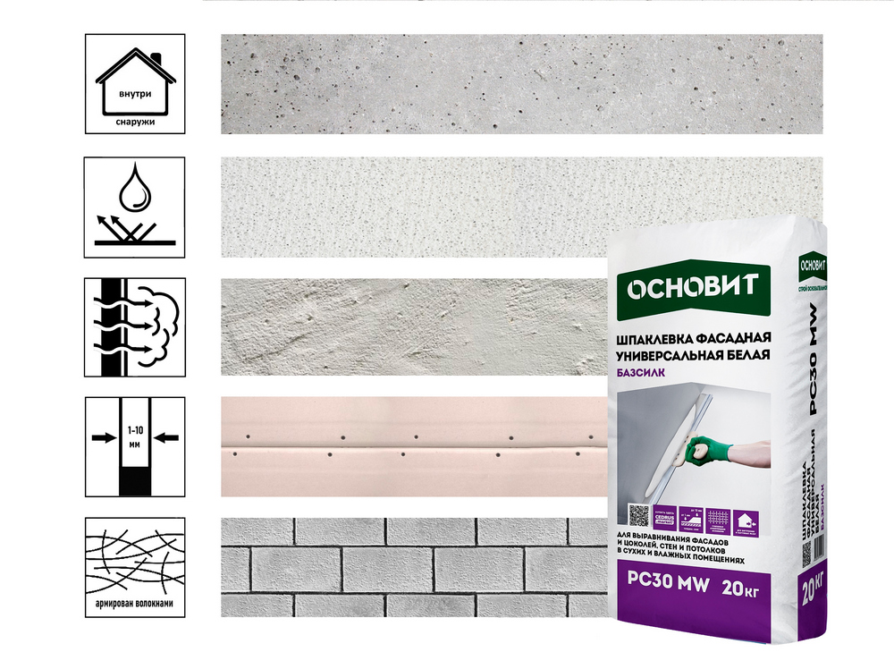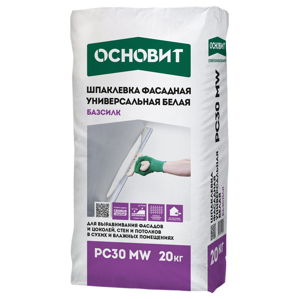 Шпаклевка ОСНОВИТ БАЗСИЛК PC30 MW предназначена для выравнивания стен и потолков в сухих и влажных помещениях, фасадов, цоколей.