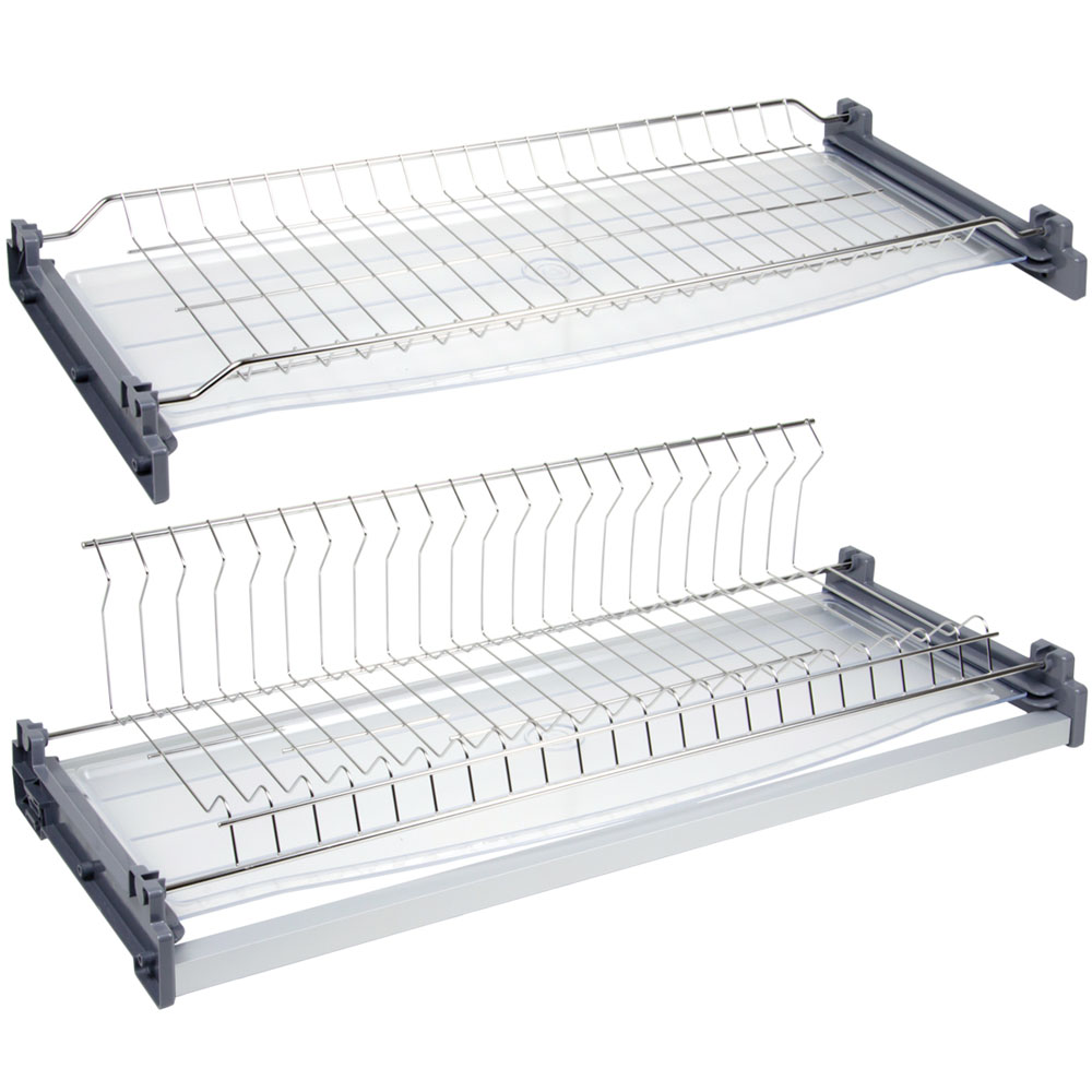 В комплект входит: 2 уровня сушки (решётка для кружек и L-образная решётка для тарелок), 2 пластиковых поддона, 2 комплекта пластиковых держателей нижнего и верхнего уровня, 2 соединительных трубки, саморезы M4x20 – 10 штук, 3,5х8 – 4 штуки.