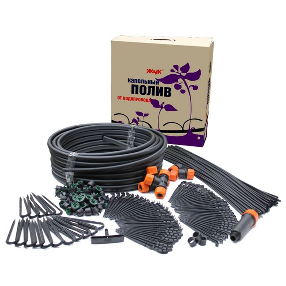 С помощью магистрального и подающего шлангов вода подводится к каждому растению, стрелка с зажимом устанавливается точно под корень куста. Фильтр тонкой очистки продлевает срок службы системы. Цанговые зажимы обеспечивают надежность соединений и предотвращают заломы магистрального шланга при поворотах на 90 градусов.