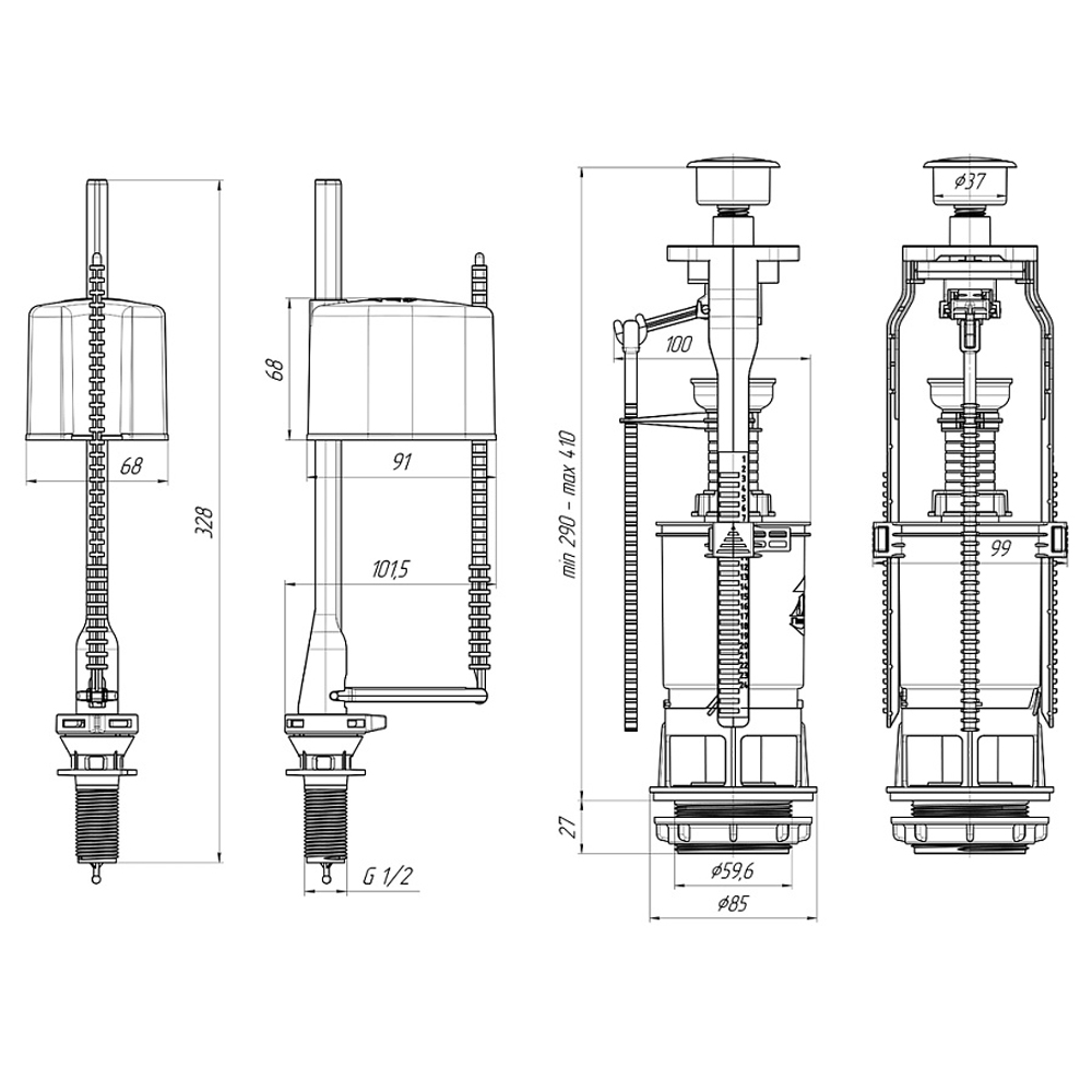 Наливной механизм с нижней подводкой и пластиковой резьбой диаметром G 1/2" можно регулировать по высоте от 234 до 328 мм.