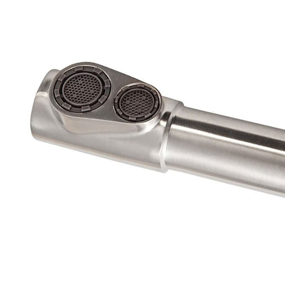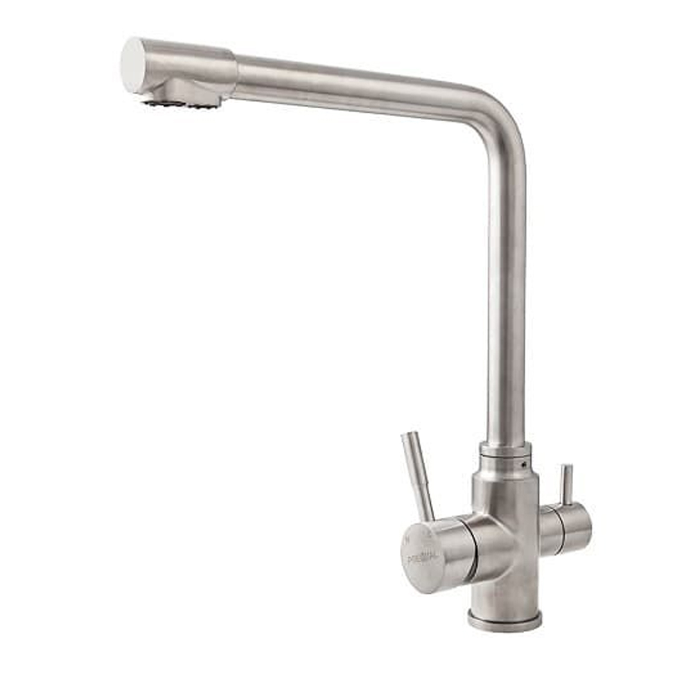 Комбинированный смеситель для водопроводной и фильтрованной воды из коллекции «Чистая вода» (двухрычажные смесители). В прямоугольном изливе с углом 90гр. в параллельных изолированных каналах вода из разных источников не смешивается. В Складской программе смеситель в трех видах обработки поверхности — «Сатин», «Полированный», «Графит», «Пинк Голд».