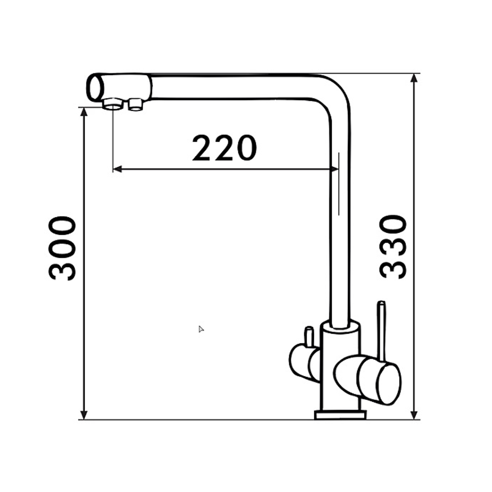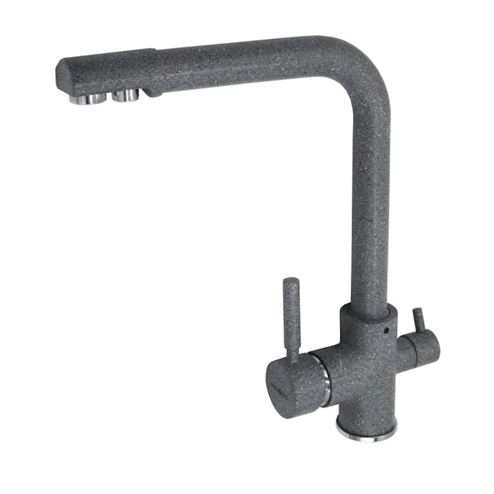 Кухонный комбинированный смеситель с высоким прямоугольным двойным изливом. Смеситель с двумя рычагами и двумя изолированными параллельно каналами для воды из водопровода и воды от фильтра. Корпус выполнен из латуни, излив стальной, круглый, поворотный. Сверху композитное покрытие из мраморной крошки.